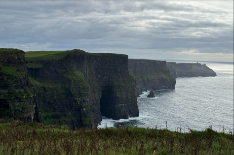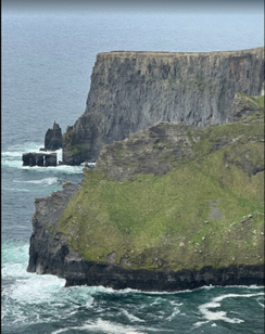 We finally made it to the Cliffs of Moher, a dramatic, wind-swept high cliff, where people have committed suicide by jumping to their deaths below the cliffs. Consequently, many barricades have been set up to make it difficult for people to meet their goal. These wild waters are a favorite of surfers, often scoring the highest waves in any sea. Linda and I walked to see the dramatic views, and we were exceptionally fortunate. This stretch is known for rain and high winds. We experienced neither, and we enjoyed climbing long stretches of steps to ascend to the top of the hill for terrific views and photographic opportunities. We even enjoyed an ice cream from the local vendor.