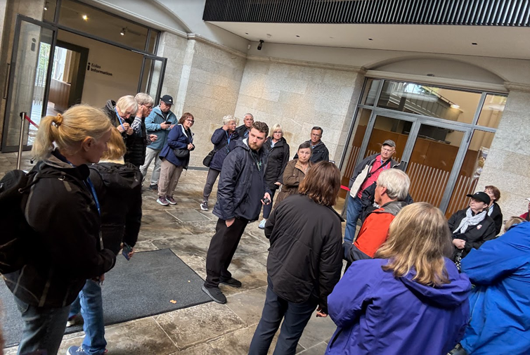The Rick Steves tour group met initially at 2:00 pm to be briefed on rules and regulations, and provided information as to where we would visit until we arrived in Dublin. Our first order of business was to find a buddy pair. We each had to introduce ourselves and where we were from. I was surprised to learn that Linda and I had been married for the longest time and did not think that we were the oldest in the group. Several said that this was not their first tour with Rick Steves, with a few saying that they had already been on 5 tours. We teamed up with Rex and Diane. The idea is that after each venture, often hiking around tourist spots, we verify that our buddies get back on the bus and are accounted for. There was a funny moment. There were two sets of friends from the same town in Illinois. He was Rick, and the other guy was Steve. Kelli pointed out that they were not related to Rick Steves.